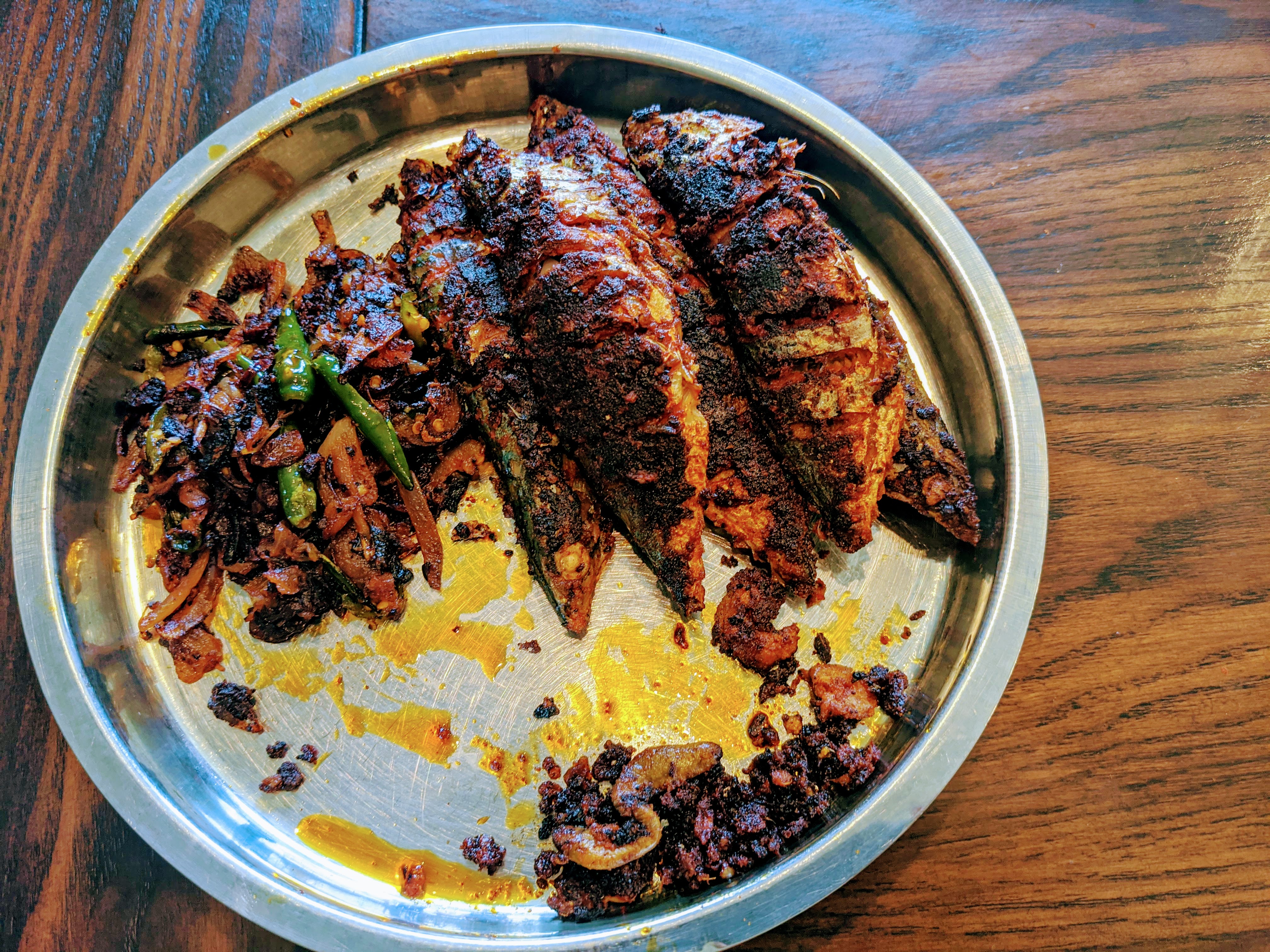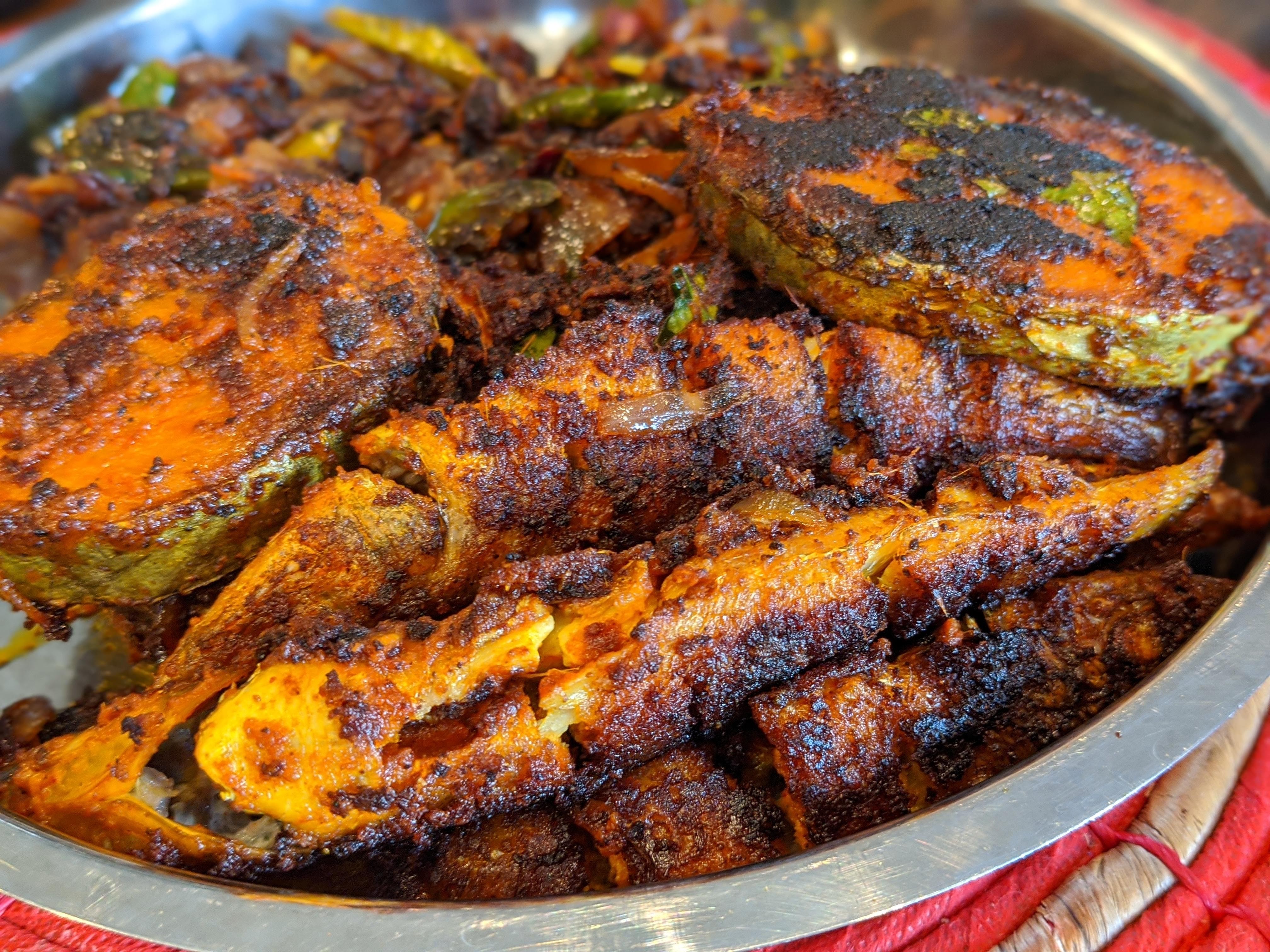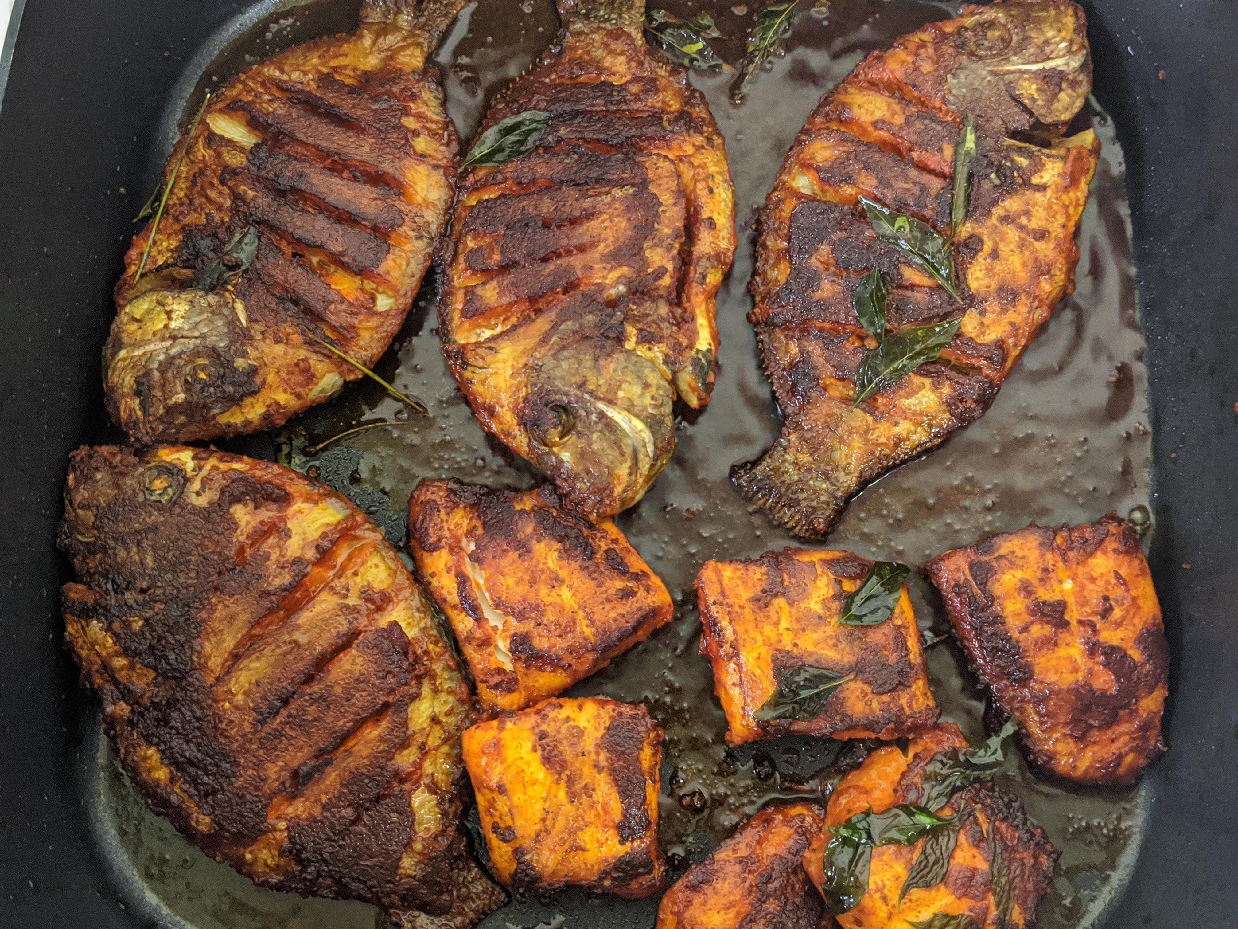 After plating the fish add the lightly fried onion green chili, curry leaf mixture on top. I have few pictures below of few fish fry at home with king fish, lady fish, anchovies, mackerel, pearl spot, tilapia.