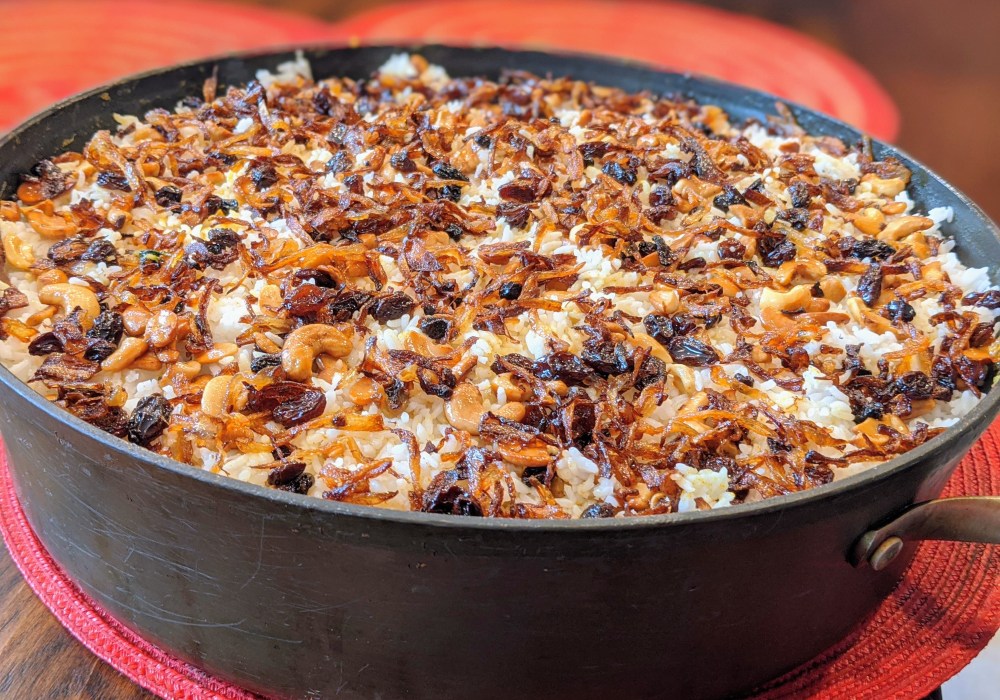 Sprinkle fried onions and fried cashews and raisins evenly on the layer. If you have more than one layer repeat this process.
