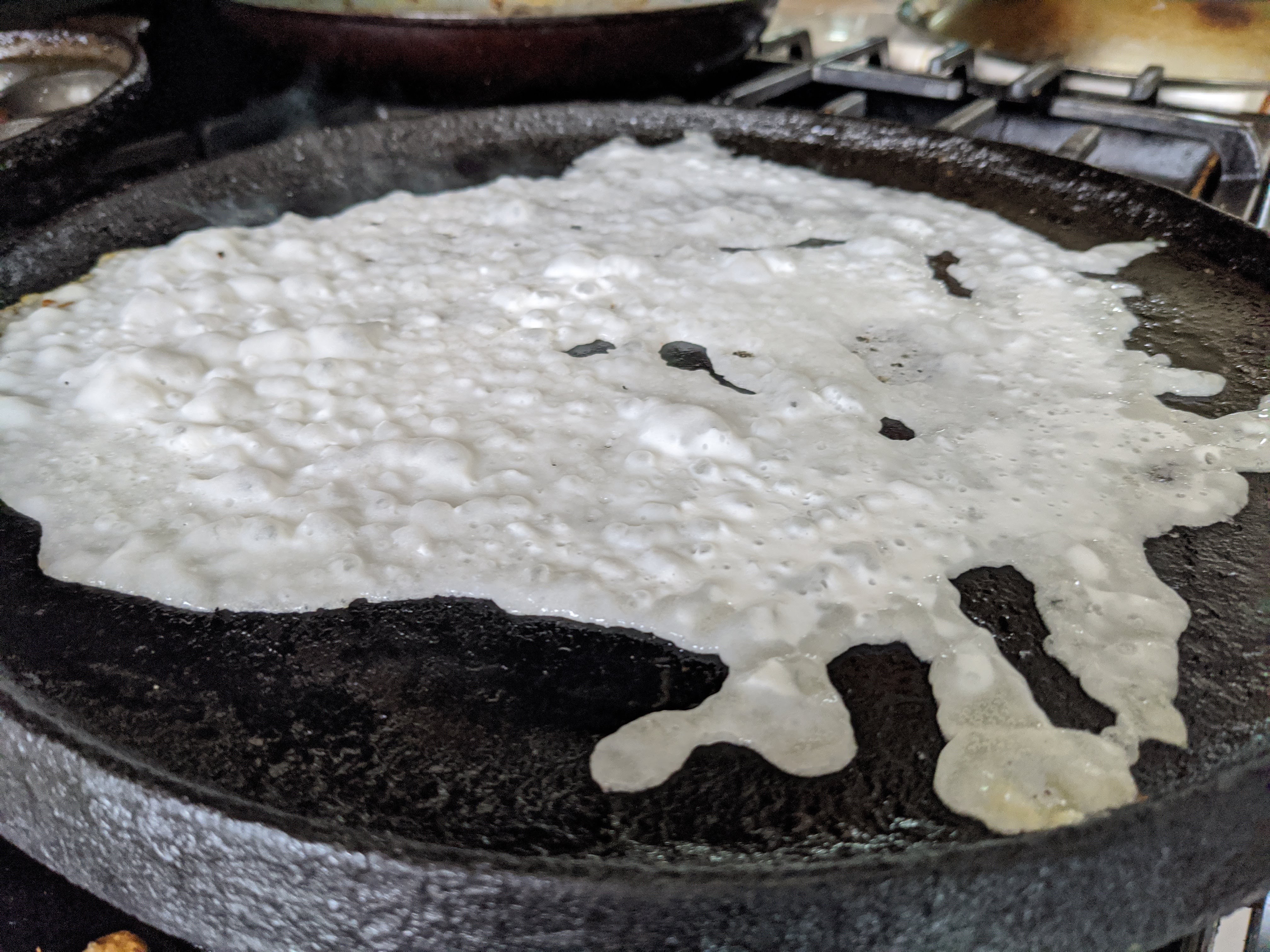 On the tawa (cast iron is the best) pour the batter and try to rotate tawa and have it as thin as possible.